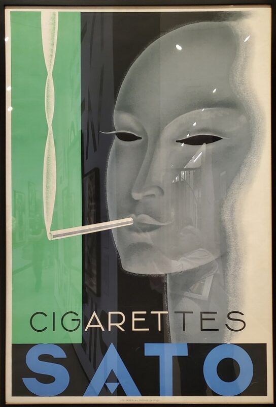 Here is a trio on display. On the left from 1933 is Week End Cigarettes. This is another example by Paul Colin and commissioned by the French government’s cigarette monopoly started in 1932. Its mission was to compete, and in response to, the lighter tobacco brands called “gout anglaise” (English taste). The poster design incorporates three similar smokers sharing a pack as they lounge, enjoying their life of leisure.