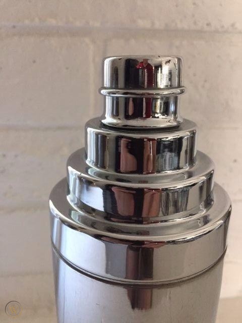 The first is a skyscraper cocktail shaker purchased at a GoodWill. Made by Evercraft, what makes this an unusual piece is the cap. We have not been able to find this shaker with this cap in any search. What we did find is this shaker with a stepped lid.  Conversely, we found a similar top on a Farberware (Japan) cocktail shaker.
