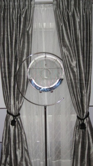 The crowning glory of my room, in my opinion, is my ceiling light. Also purchased on an online auction site, the six sides are heavy, pierced metal in a platinum finish with a canopy of frosted glass panels. It took the two of us (thank you, Anthony) to attach the shade as it weights around 12 lbs. and is held up by six individual spire-like fittings at the top. Awkward to install, but worth it. A close runner up for favorite room accessory is my sunburst floor lamp purchased at Stoudt’s in Adamstown, Pa.