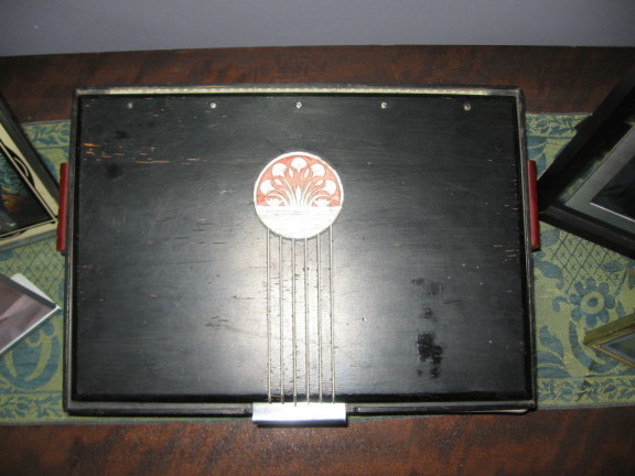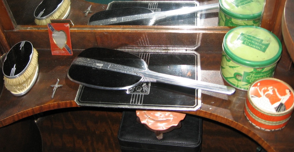 I found this complete (11 pieces), 1932 bedroom set on an online auction site for $500.00 (thank you, Mrs. Whithersole’s son). The rich walnut wood tones soften the industrial “chrome” trim and provides a counterbalance to the solid colored draperies. I like it for its warmth, masculine lines and maroon Bakelite handles accented in brass. The veneer is  book matched, straight cut walnut in a chevron pattern accented with panels of  burled wood. Even the vanity has a more masculine quality than most and serves as my full length mirror. Nothing beats the quality and construction of this set; it was made to last – and it has!