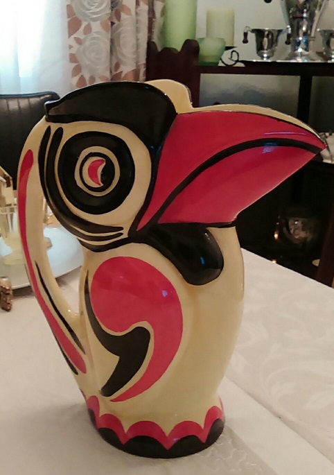There is a good mix of items from old to new and deep sale prices up to 50% in some booths.  Chris picked up a large 1930’s Czech Toucan Pitcher (not on sale) and an amber Farber Cambridge decanter set.