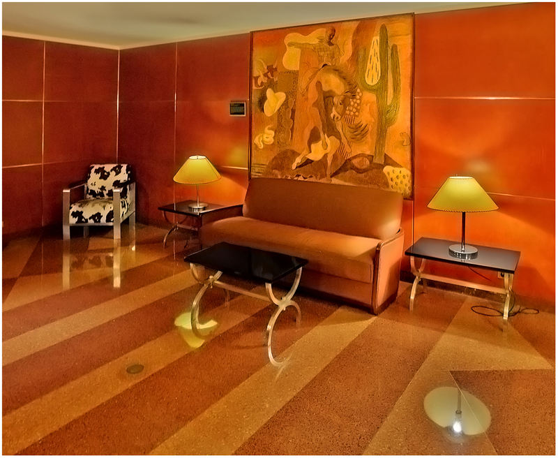 Donald Deskey in the second mezzanine's men's lounge at Radio City Music Hall.