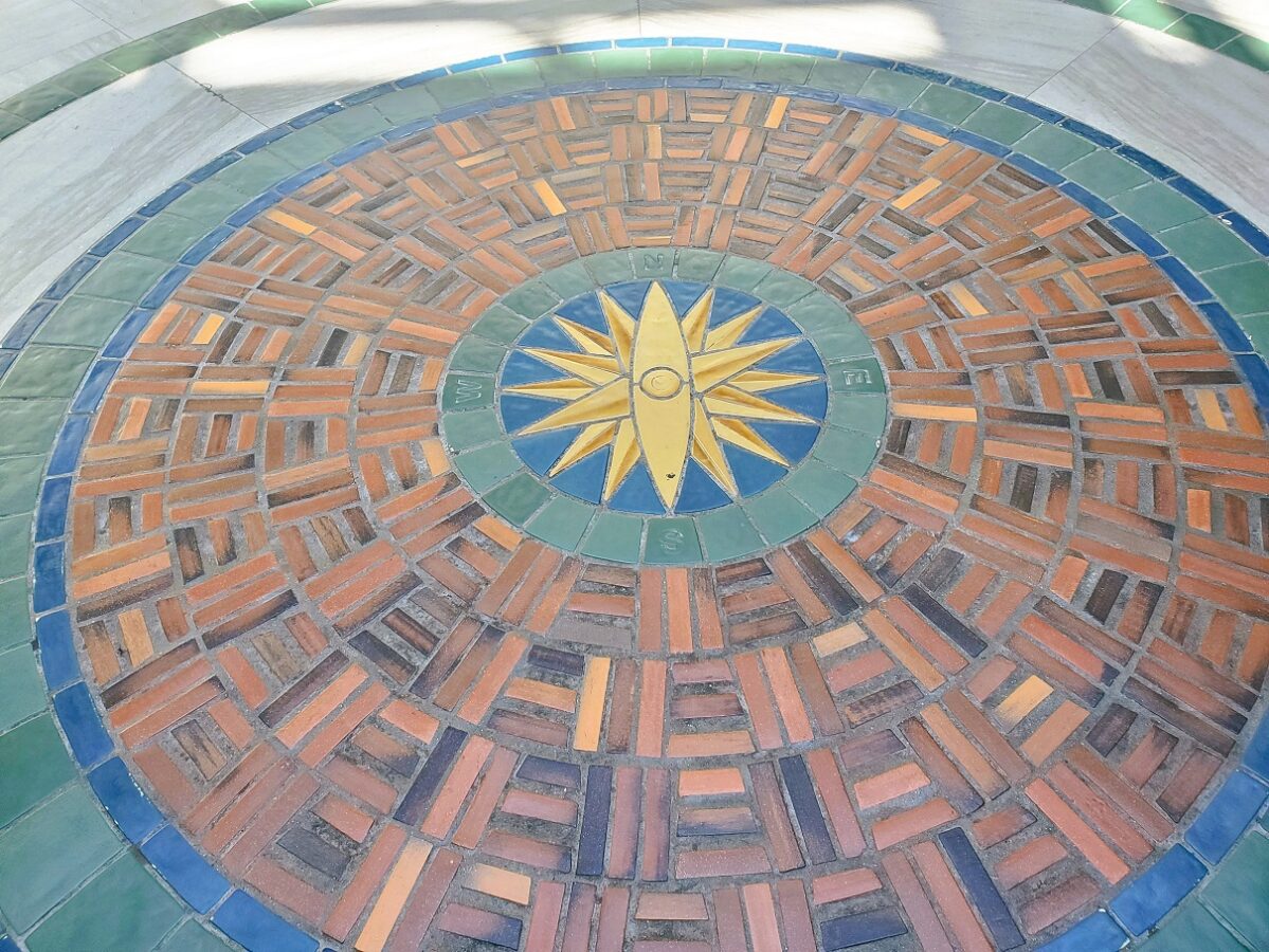 Bronze inlays symbolizing air, earth, fire and water, surround Mercury, the god of transportation. All are set in various tones of marble. Photo by the authors.