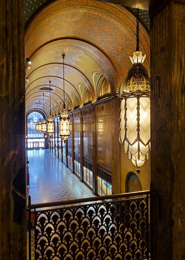 Still, with no expense spared, first class artisans contributed their talents from engineering to the fine detail work throughout. And he most notable feature is the three story arcade featuring Géza Maróti, hand-painted barrel-vaulted ceiling. Recognized as “Detroit’s Largest Art Object”, it is undergoing continued restoration since 2015 at the cost of 30 million dollars.