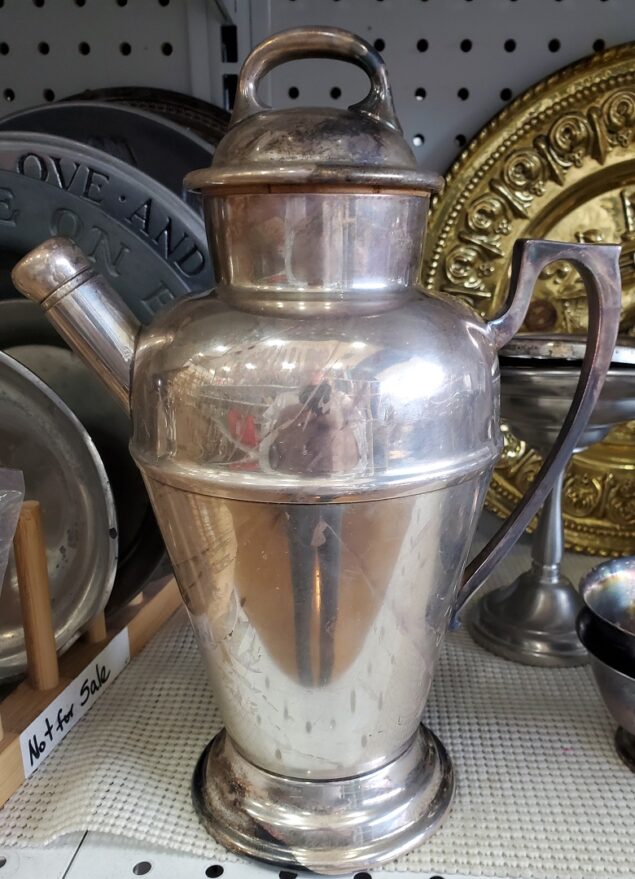 We’ve had good luck at the Good Stuff Thrift Store.  No brand silver-plate cocktail shaker purchased for $4.50.  This unusual item dates to the 1930s. The cork stopper both in the lid and also in the pour spout cap are more common features at that time.  It’s amazing what a little elbow grease (and a good polish compound) can do.