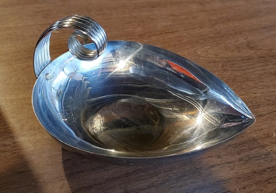 This pair of silver-plate candle holders is designed by Carl Deffner, They could be anywhere from the 1930 to the 1960s. And they have a no-polish finish. The pair cost $2.50.