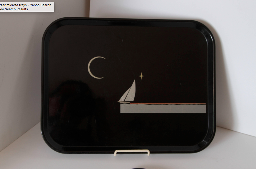 In the car on the way home, I Googled “Art Deco black and orange tray with sail boat”. One of the results was a 1stdibs.com dealer who is selling the tray and described it as being designed by George Switzer for Westinghouse. Now I was able to dig deeper into this tray’s history. I also learned that Switzer designed five other Micarta trays for Westinghouse in 1932. So now I wanted to find out exactly what was Micarta.