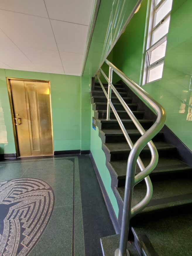 Kaufmann requested and was granted permission to hire Denver artist Allen Tupper True to design the decorative element.  True cleverly, and with some resistance, incorporated elements of the Navajo and Pueblo tribes in the designs. Some of the best examples are see in the terrazzo floors.