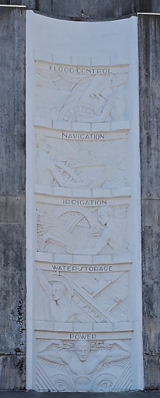 Complimenting Kaufmann’s and True’s work, sculptor Oskar J.W. Hansen designed the statuary. A bas-relief panels over one of the original elevator towers memorialize the workers killed in the building of the dam. And the other celebrates what the dam means to area it serves.
