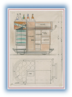 Until Art Deco Society of Washington members Deborah Sorensen (curator), Jim Linz (Art Deco author), and I unfolded and unrolled all the drawings, I did not realize how many there were. In truth we saw several of his designs for the very first time as we inventoried the collection. Predominantly, Edgard used pastels or pencils to create his designs. Until 2003, his portable wooden container of design & drafting tools was in our basement. Sometime between then and when we created the collection, it has gone missing. Hopefully it is somewhere in one of the homes among our family.
