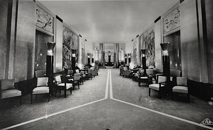 The Grand Salon featured a huge mural by Jean Dupas, entitled “The History of Navigation and tall illuminated glass pillars by Lalique.