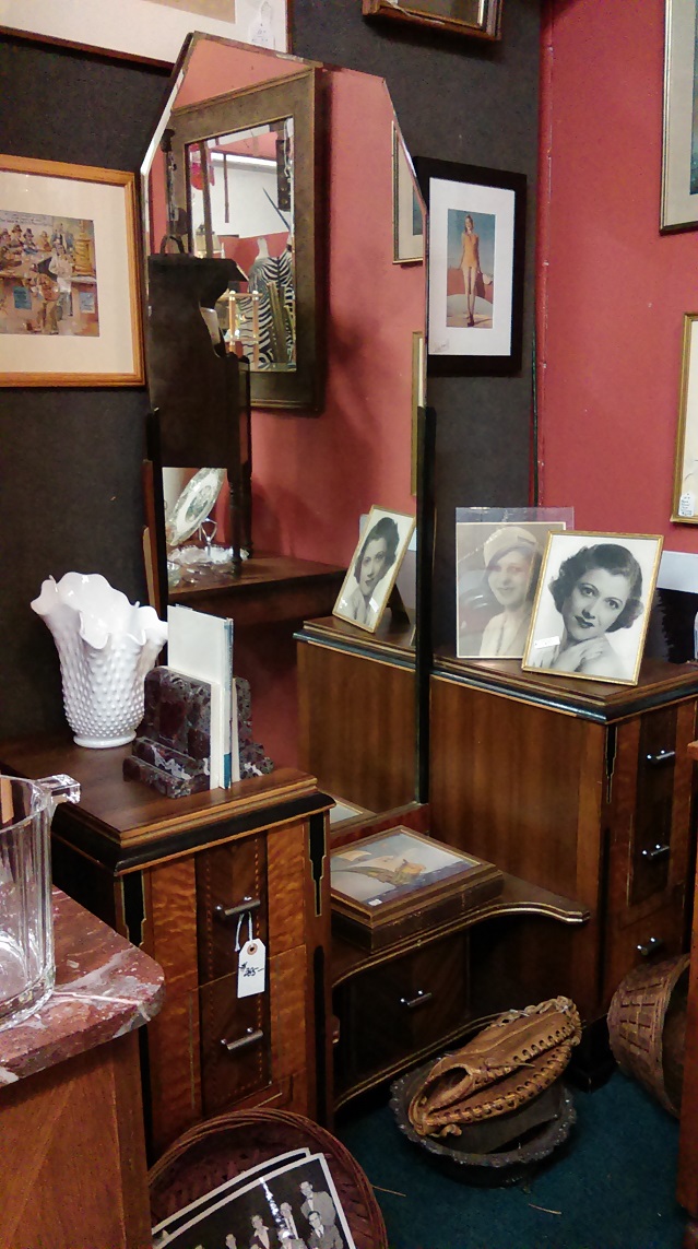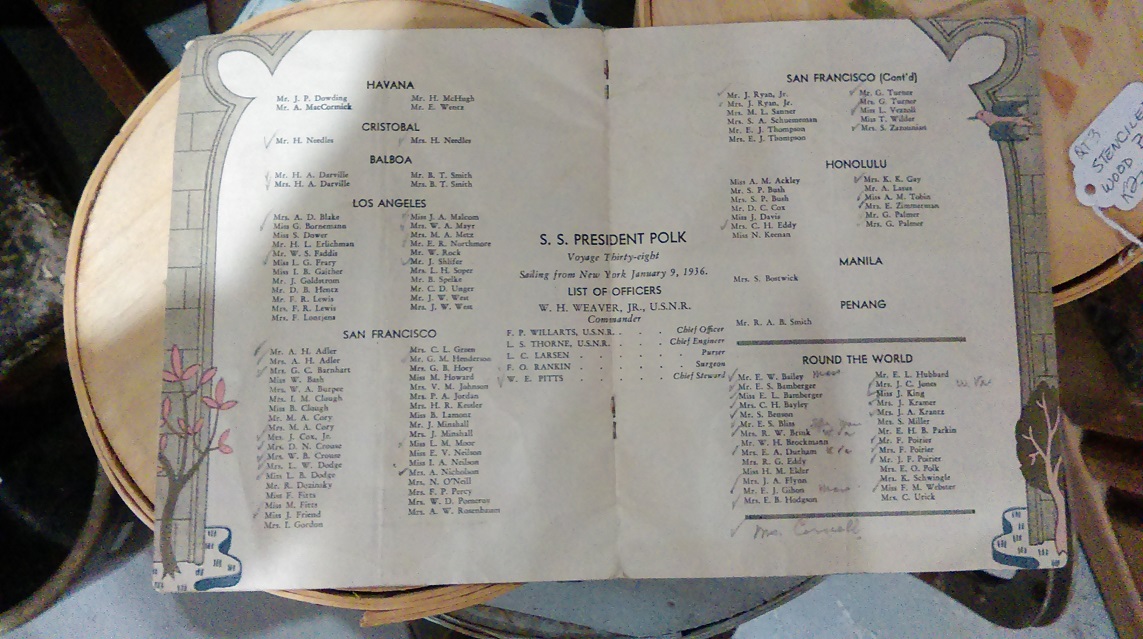 The new store is large and bright with spacious aisles. A great mix of merchandise from higher end antiques to usable and collectible household goods. Well laid out, prices are more than fair. The front building is mostly better-quality items in cases and as you move toward the right, the aforementioned household items, then larger furniture pieces. I purchased a passenger list booklet from 1936 for the S.S. President Polk, part of the Dollar Steamship Line, for Anthony.