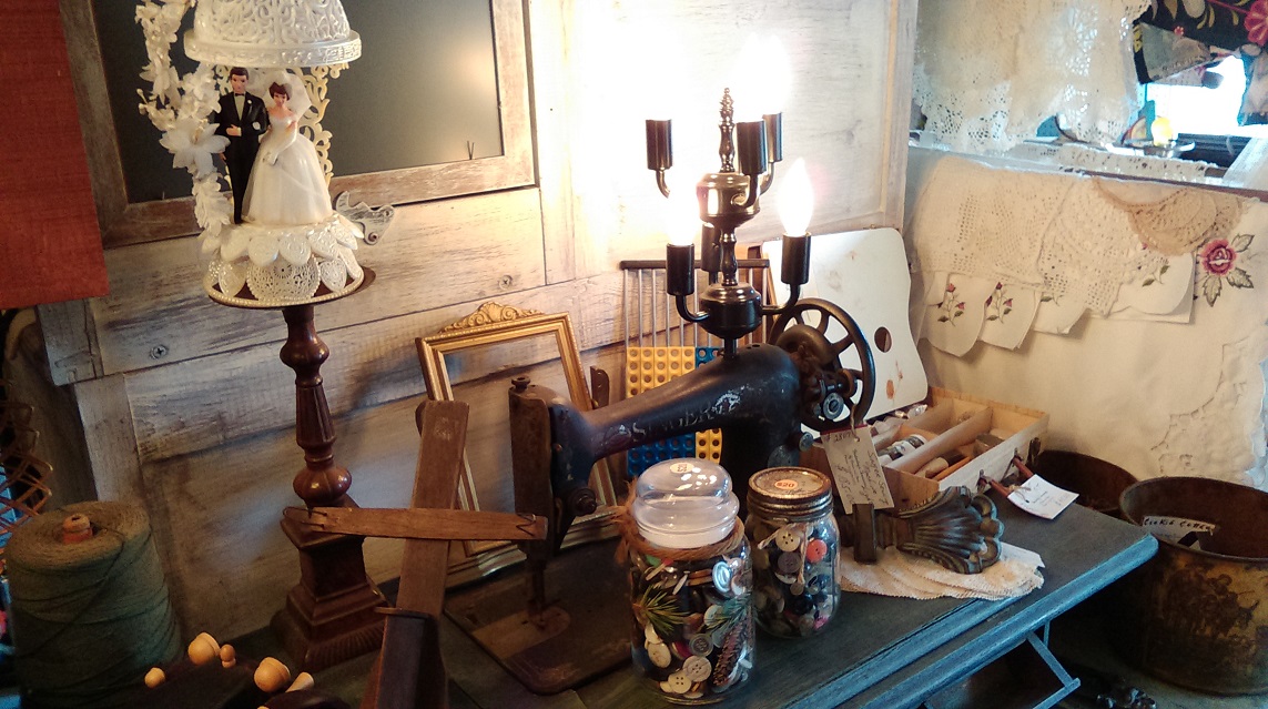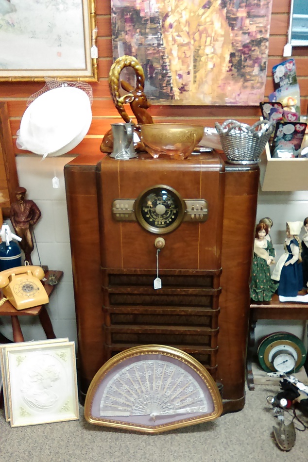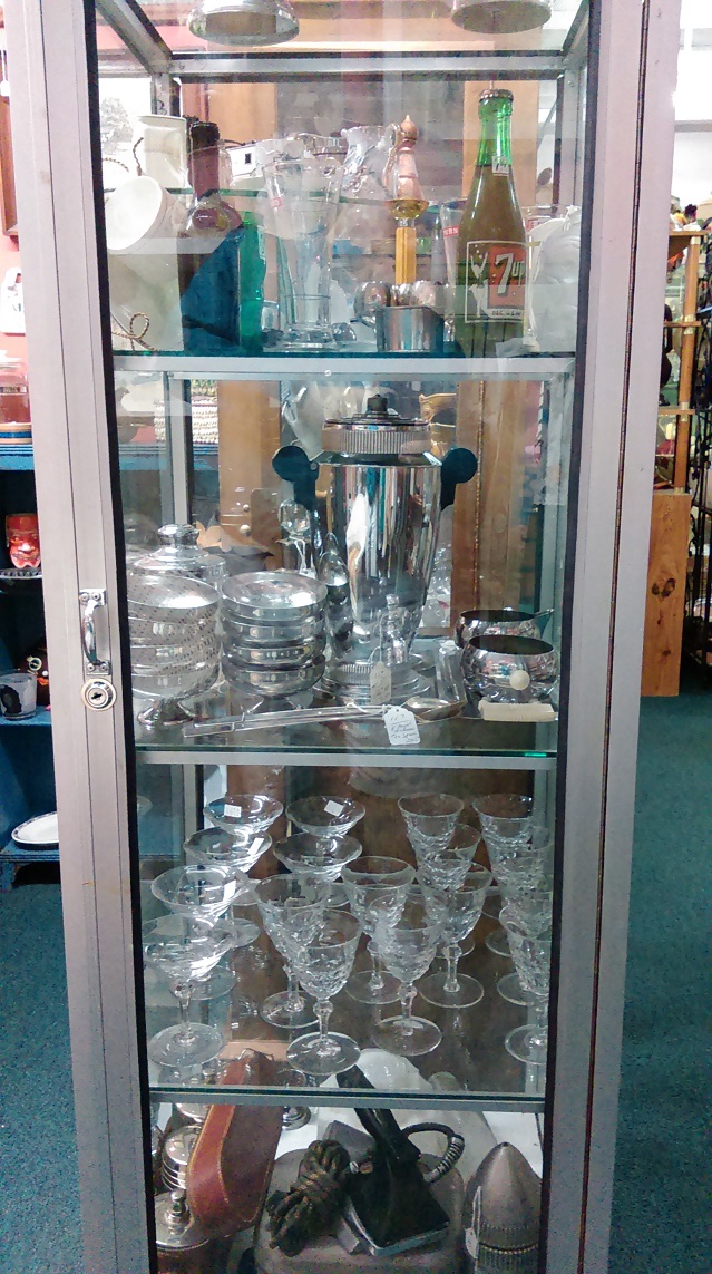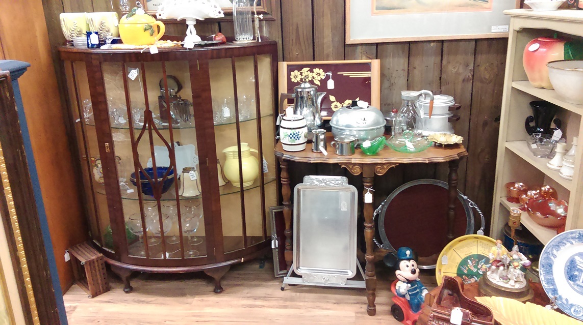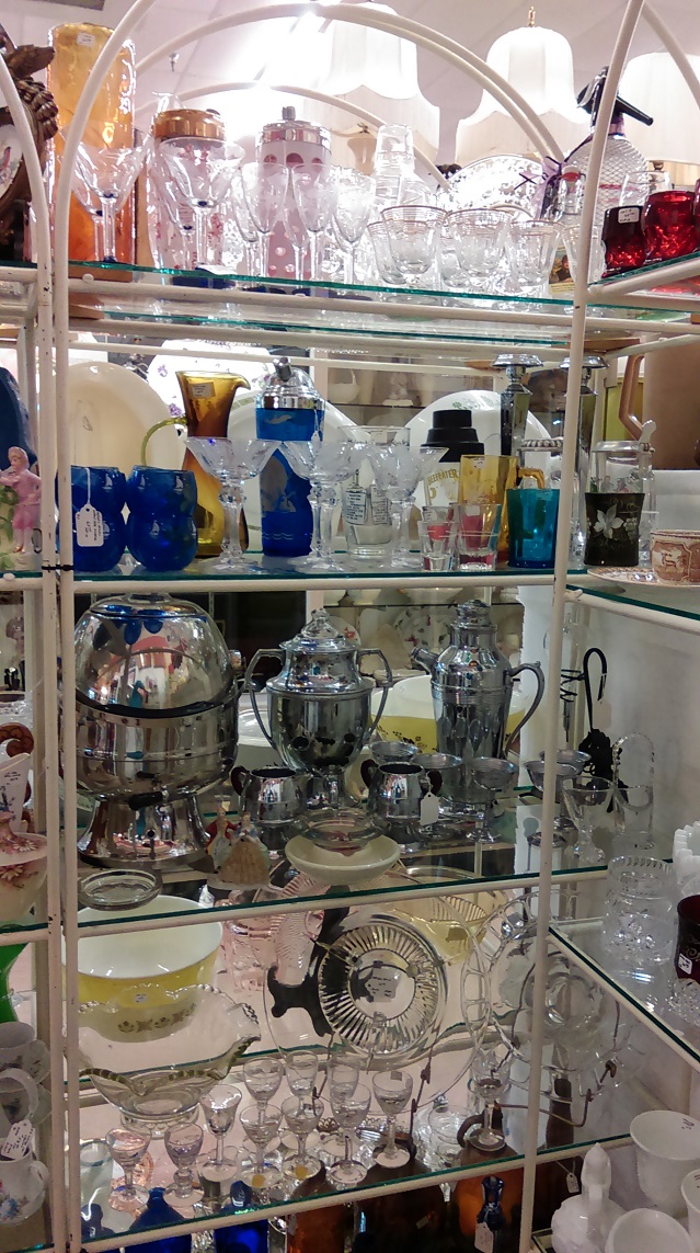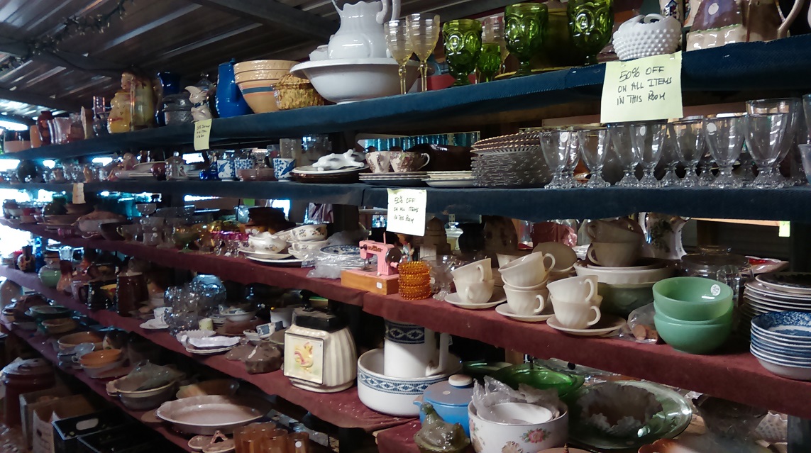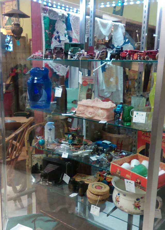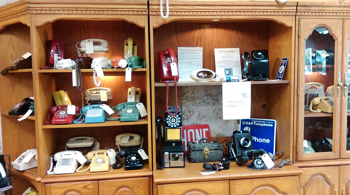 The store has 4 rooms with Vintage and collectible phones, better collectible glassware and ceramics are in room #1. Vintage and newer Christmas items are in room #2; Kitchen and dishware in room #3 and tools, maps, etc., in room#4.