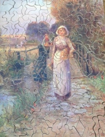 Early jigsaw puzzles did not have true interlocking pieces and sometimes, no picture to guide you! They covered a variety of subjects including storybook characters, historical scenes, fantasy bucolic visions of homes and gardens .