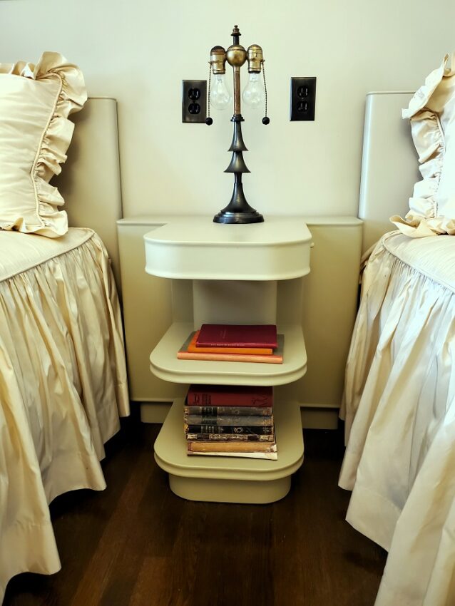 The built in Art Deco side table between the beds reflects the same design and color as the coffee table. Note the conveniently placed outlets above. No detail was considered too small to be overlooked.
