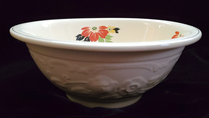 - Royal OvenServe bowl. The embossing is typical of Oven Serve pieces. Clematis decal. From the collection of Chris Arena.
