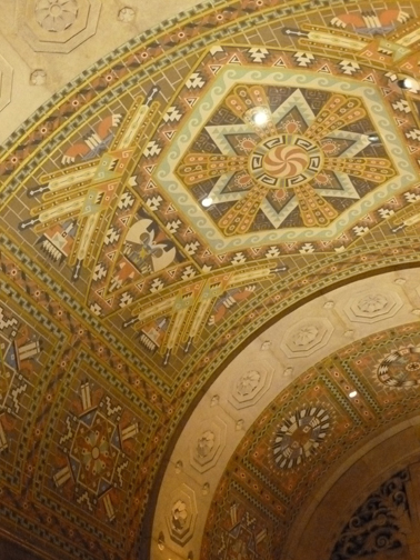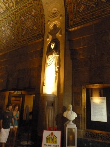 The ceiling is Guastavino tile in Native American motifs. The elevator lobby is high style Art Deco executed in bronze. The tour ends at the observation deck with wonderful views of downtown Buffalo as well as Lake Erie and southern Ontario, Canada.