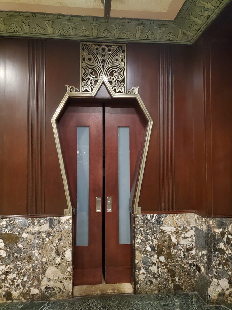 Elevator bay at the Netherland Plaza Hotel.
