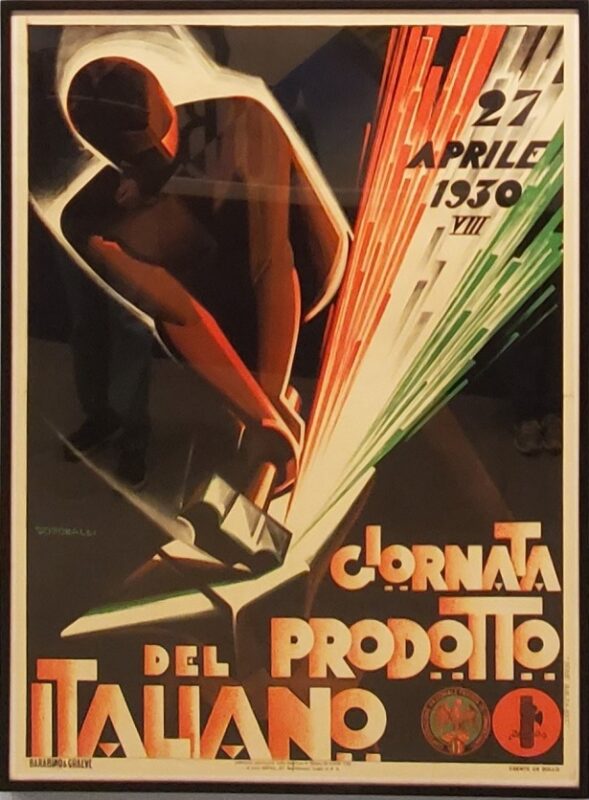 Giuseppe Riccobaldi del Bava (Gionata del Prodotto Italiano, 1930). The numbers under the 1930 indicate Mussolini’s 8th year in power.  It advertises a festival of Italian products with emphasis on food, textiles, artisanal and industrial wares. The target audiences is communities with large Italian-speaking communities both in Italy and internationally.