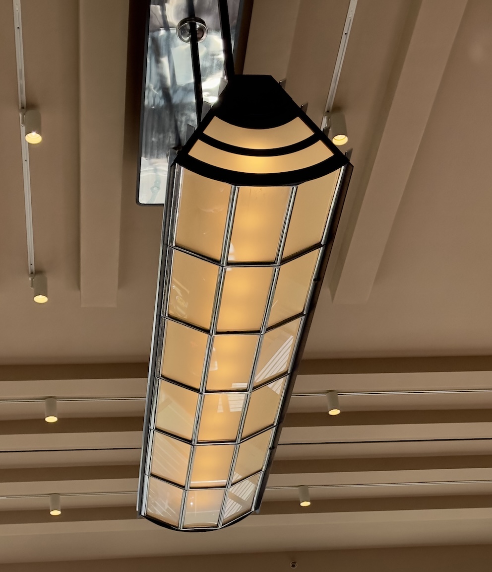 Detail of the polished aluminum and frosted glass lunchroom ceiling lights.