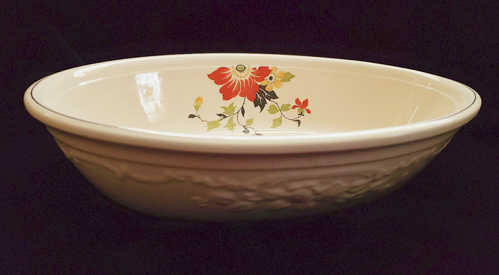 - Royal OvenServe bowl. The embossing is typical of Oven Serve pieces. Clematis decal. From the collection of Chris Arena.