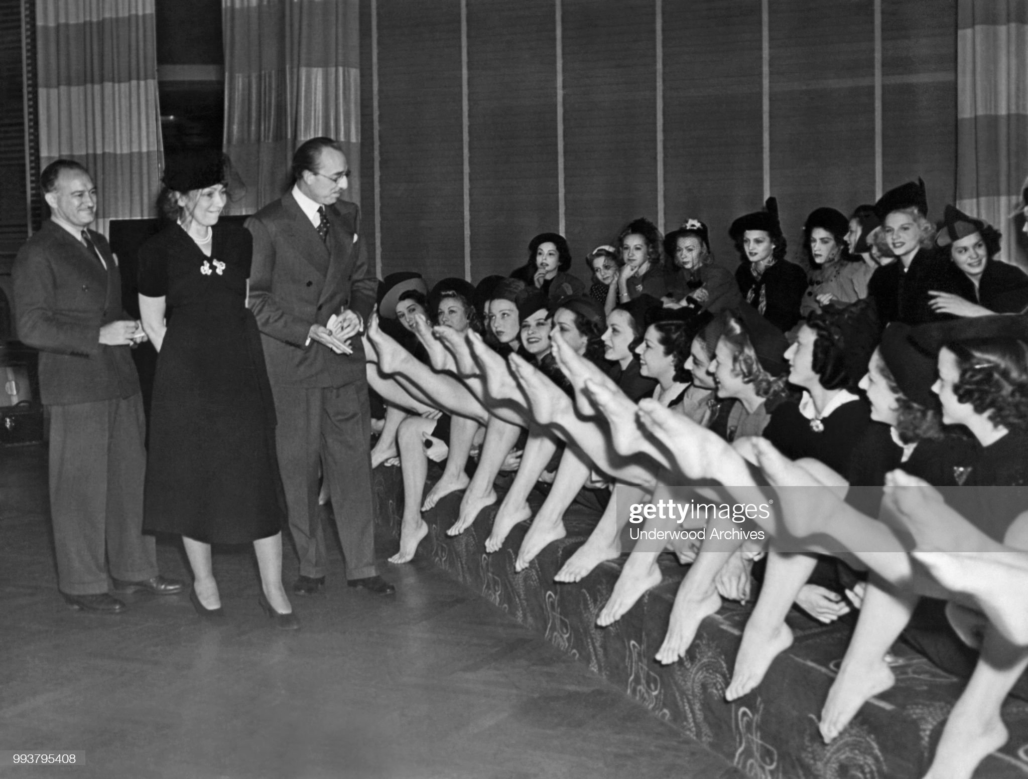 International Casino showgirls in being judged in a face and feet beauty contest, sitting on the Cosmopolitan Salon band stand, New York, New York, March 16, 1938. (Photo by Underwood Archives/Getty Images)
