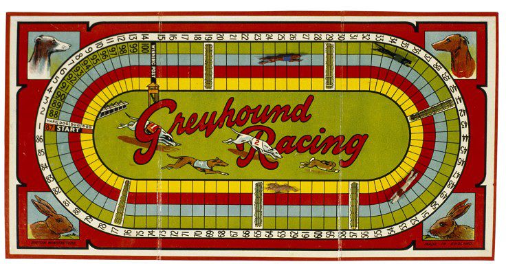 Flash forward a few millennia and England produced the greyhound racing game. In this game greyhounds race around a track chasing a hare. Two different sized dice are used and the smaller one represents the hare. The players moves their dog in turn, but the hare moves at each throw of the dice.