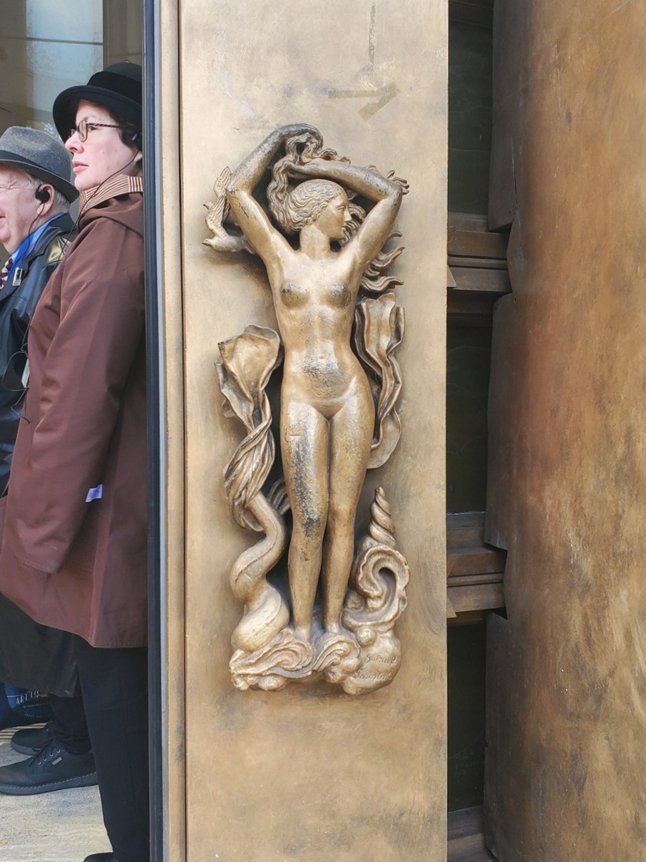 As the bus stopped for a red light, a very tall Art Deco lamp post caught my eye. Because of the rain speckled window I could not get a great photo of it. The light was designed by a master French metal worker, Raymond Subes (1891 – 1970). These lights have a fascinating history that you can read about by clicking here. This would not be the last time that day we would run into Raymond Subes’ work.