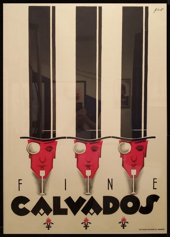 This is a circa 1930s Fine Calvados poster by Noël Fontanet a prolific Art Deco designer. Here he uses a trio of upper-class gentlemen to publicize an “affordable” (read: low-grade) brandless product. Simple, triple geometric forms is an oft used Art Deco motif. Fontanet reworked this design in a 1942 poster for Morgafarin seen on the left. But this image is a not part of the collection and was included by them just for comparison.