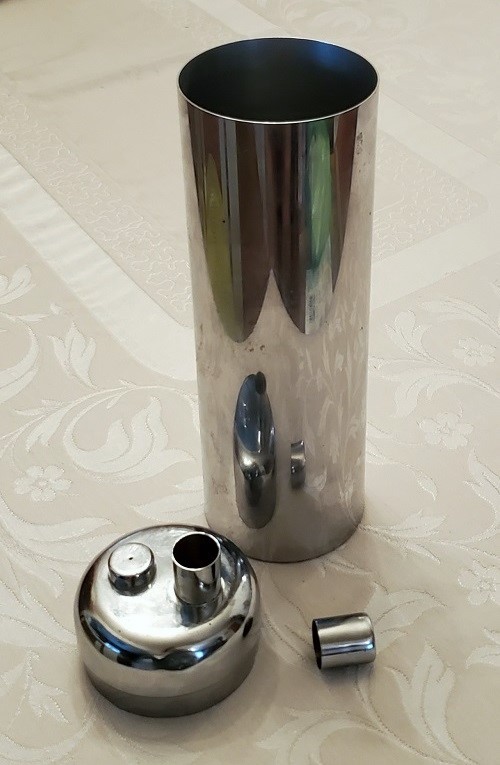 A silver plate cocktail pitcher was our other purchase that weekend from the German Trading Post / Antiques Showcase. Manufactured by the International Silver Company and designed by Carl Conrad Braun in 1940, the pitcher originally came with a silver plate mixing spoon topped by a pineapple. Unfortunately, the spoon is missing. So our search continues.