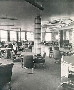 The first class dining room was capable of seating 700 at a time. Illumination came from 12 Lalique columns and wall panels, plus two very large chandeliers on either end of the room. It is easy to see why the Normandie was nick named “the ship of light”.
