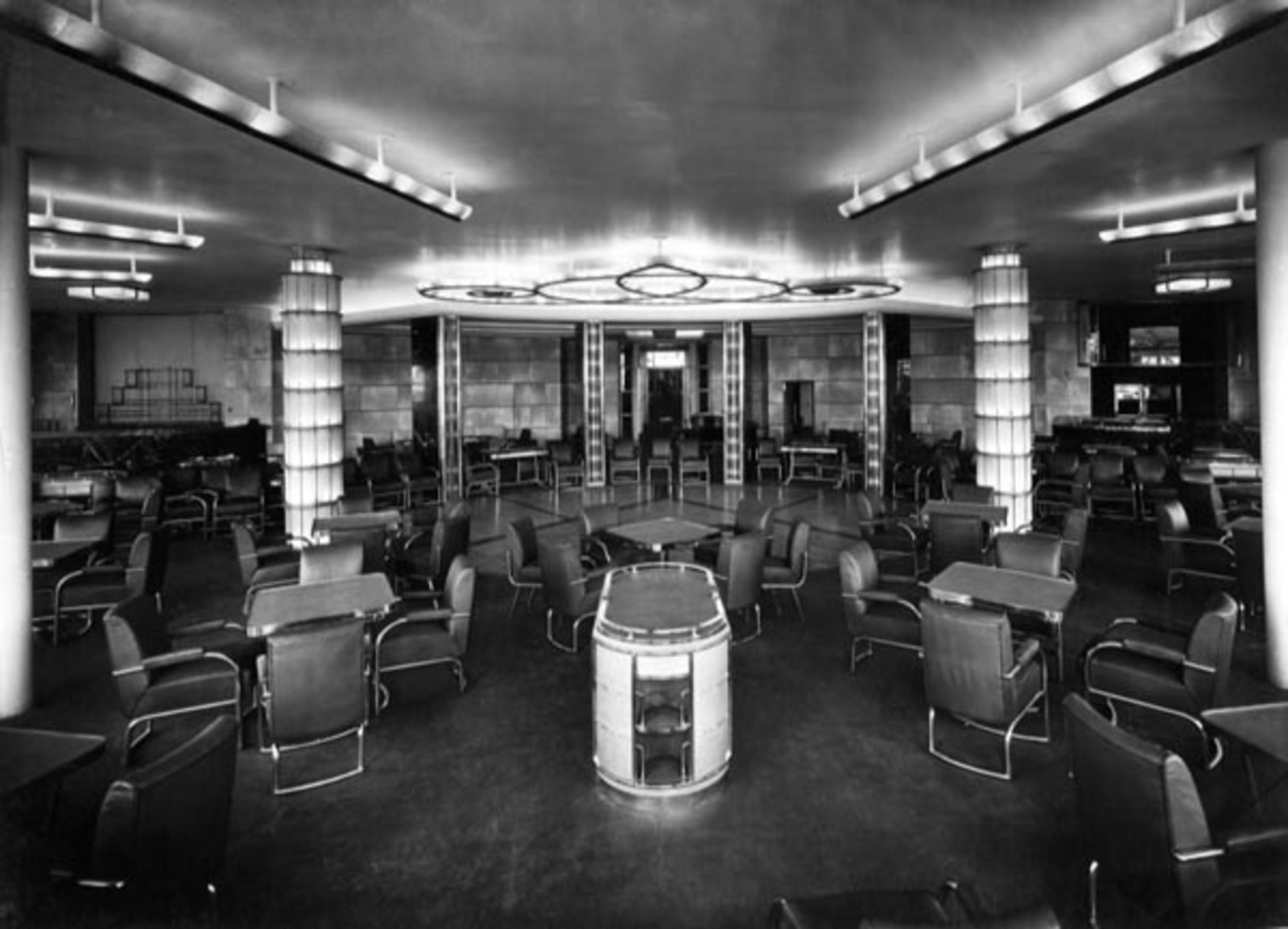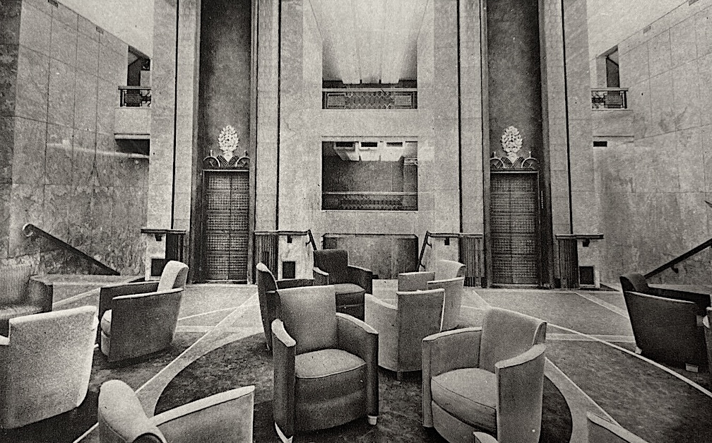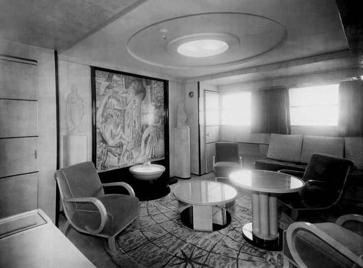 The Grand Salon featured a huge mural by Jean Dupas, entitled “The History of Navigation and tall illuminated glass pillars by Lalique.