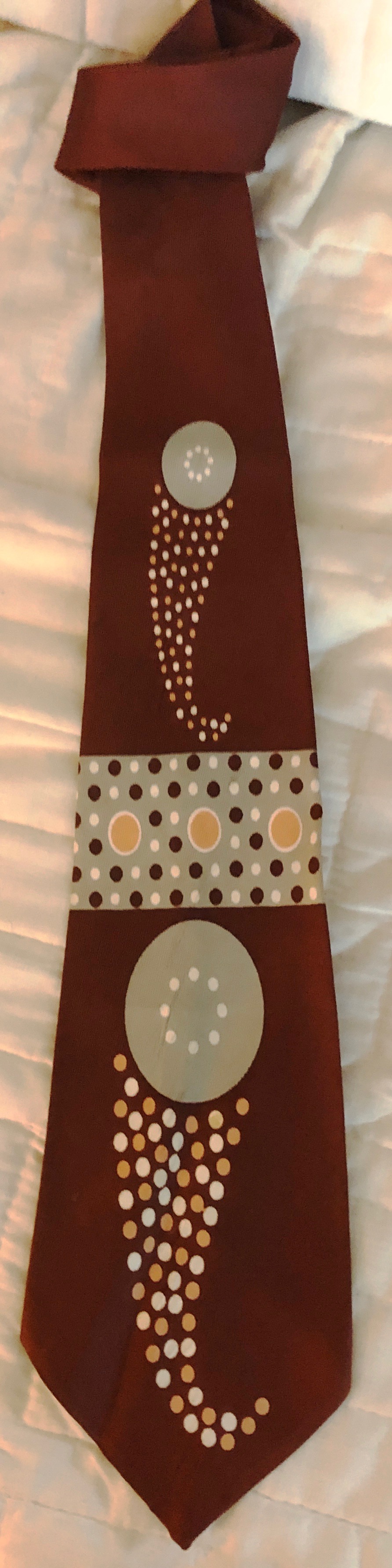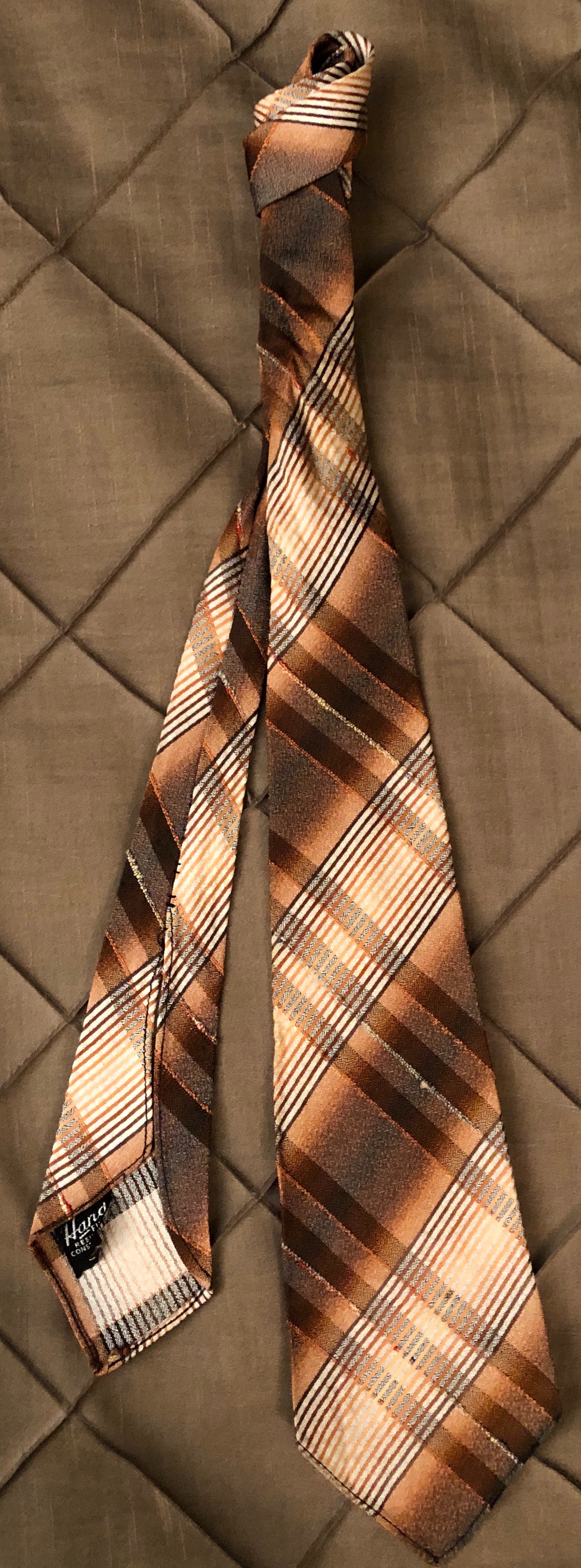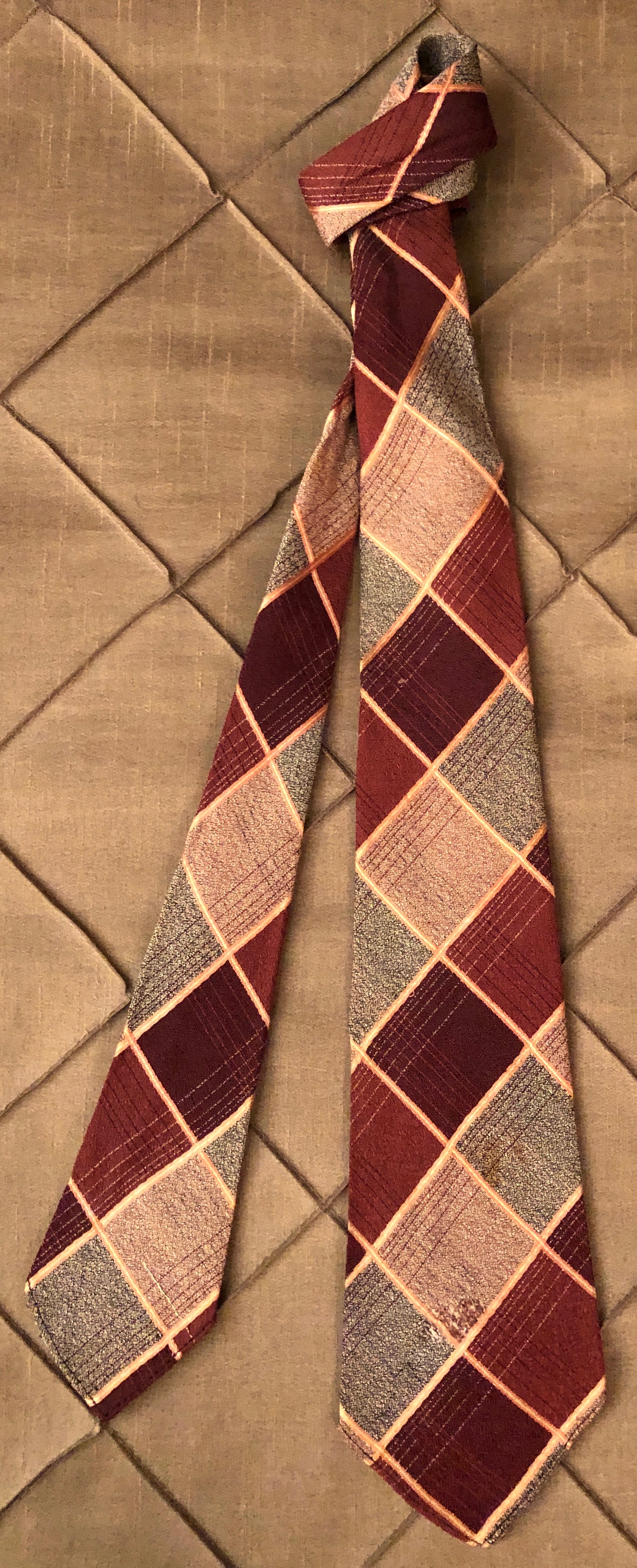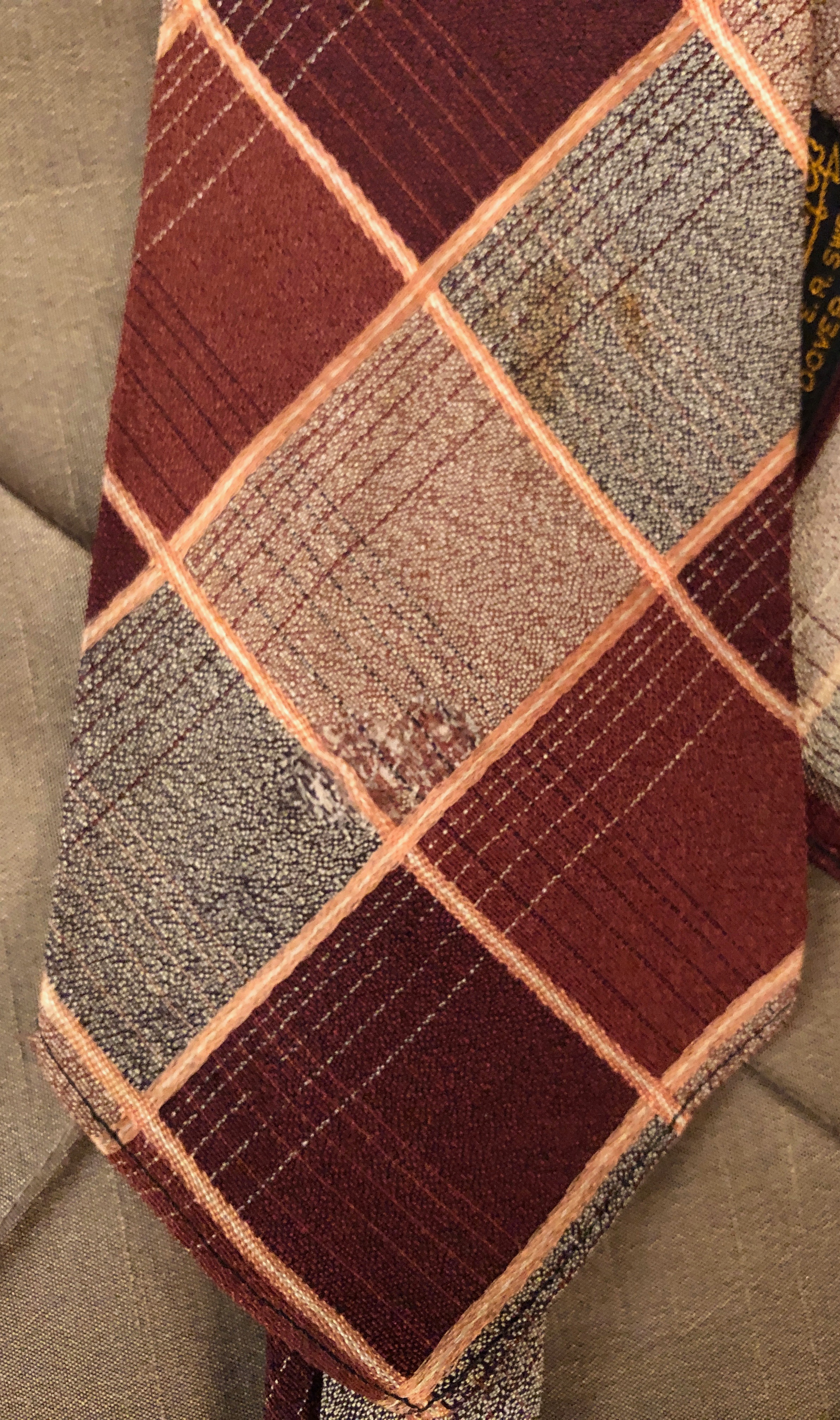 In 1992 I bought my first vintage necktie at a hospital rummage sale in Damariscotta, Maine. The tie dating from the late 1940s or early 1950s, has a bold design of polka dots in light tan, white and pale orange on a brown and celadon background. Costing only 10 cents, it was coming home with me. For many years it remained my only vintage necktie. Then I started to pick up more old ties, mostly from the 1940s, at local thrift stores. They were cheap (never more than $2.00) and they were colorful. It wasn’t until around 2007 that I started to concentrate on finding neckties from the 1920s and 1930s.