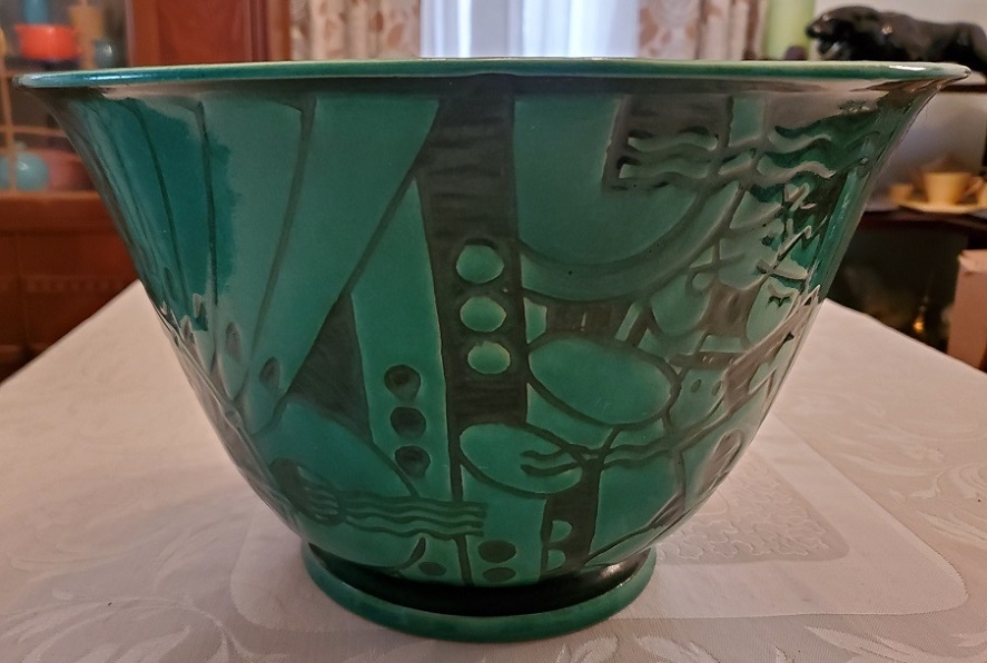 And so, no, I didn’t find THE Jazz Bowl. But I did find the later version, the “Poor Man’s” Jazz Bowl at the local thrift store. The smaller of the bowl designs, this version has the melon-green glaze. It is “Signed” Viktor Schreckengost on the side. Impressed with “Cowan” on the bottom, it measures 8 1/4 inches high and 13 5/8 inches diameter at the rim.