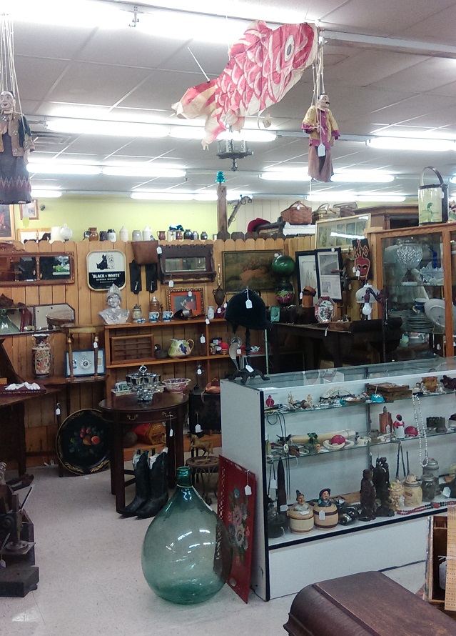 The store has 4 rooms with Vintage and collectible phones, better collectible glassware and ceramics are in room #1. Vintage and newer Christmas items are in room #2; Kitchen and dishware in room #3 and tools, maps, etc., in room#4.