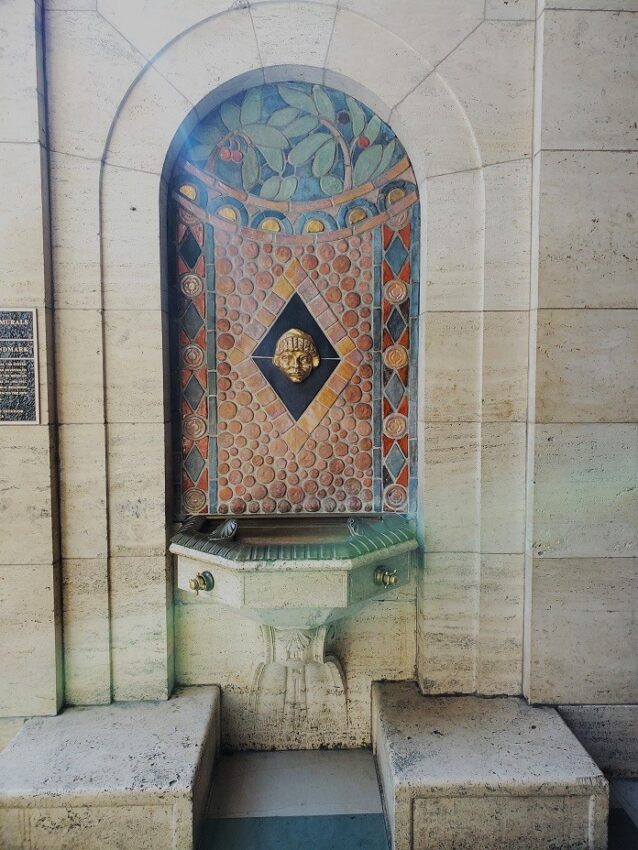 The building  is clad in marble and showcases intricate mosaics and bronze detailing throughout. The tower once feature gold leaf tiles. Covered in asphalt to prevent detection during WWII, this coating could not be removed without further damage.  Now, green terra cotta tiles illuminated by gold lights pay homage to the original design.