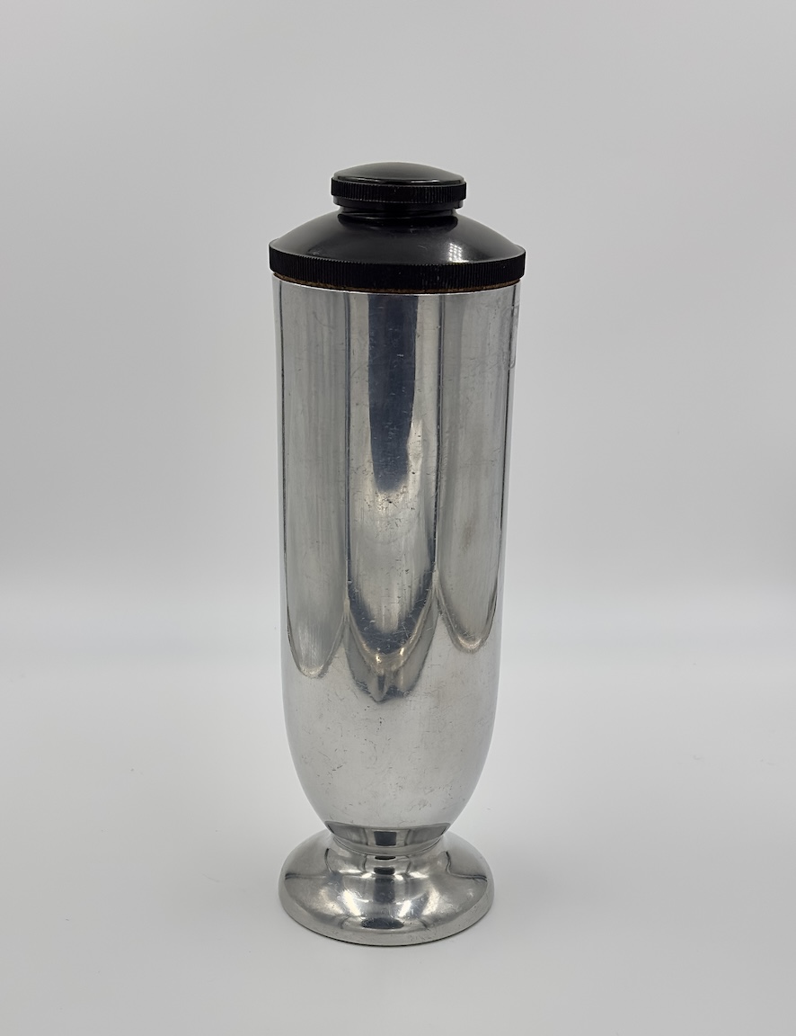 1934 Century of Progress, aluminum recipe cocktail shaker made by A. P. Co. of La Grange, Illinois.