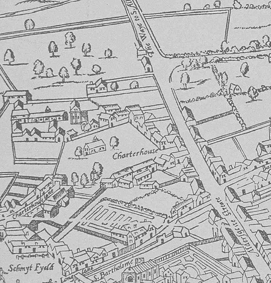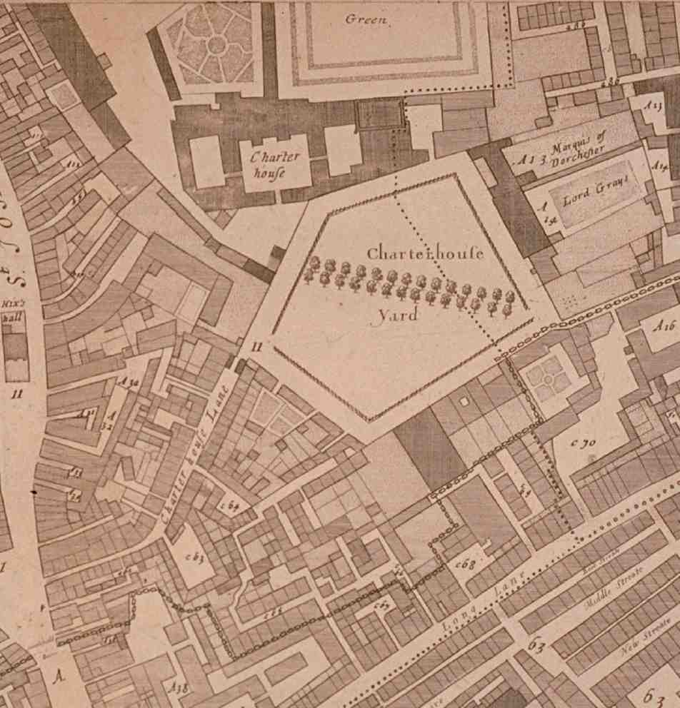 The area known as Charterhouse Square started (presumably) as a burial ground for victims of the Black Death (1347-1351). In 1560, the land belonged to the Carthusian priory and acted as a division between private residences and trade businesses. At the priory’s dissolution, the grounds became open park land.