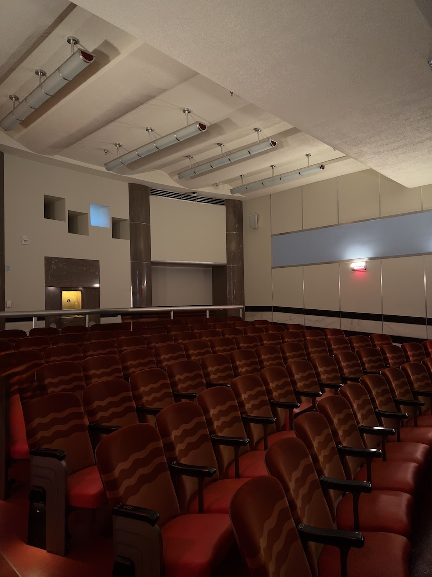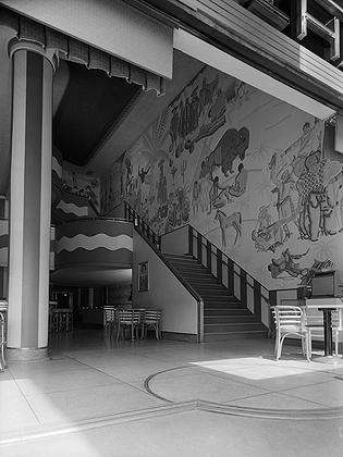 The 118-seat theatre featured more linoleum carved murals by Pierre Bourdelle, that were removed at some point, or have been covered over. Today railroad themed videos are shown in the former newsreel theatre.