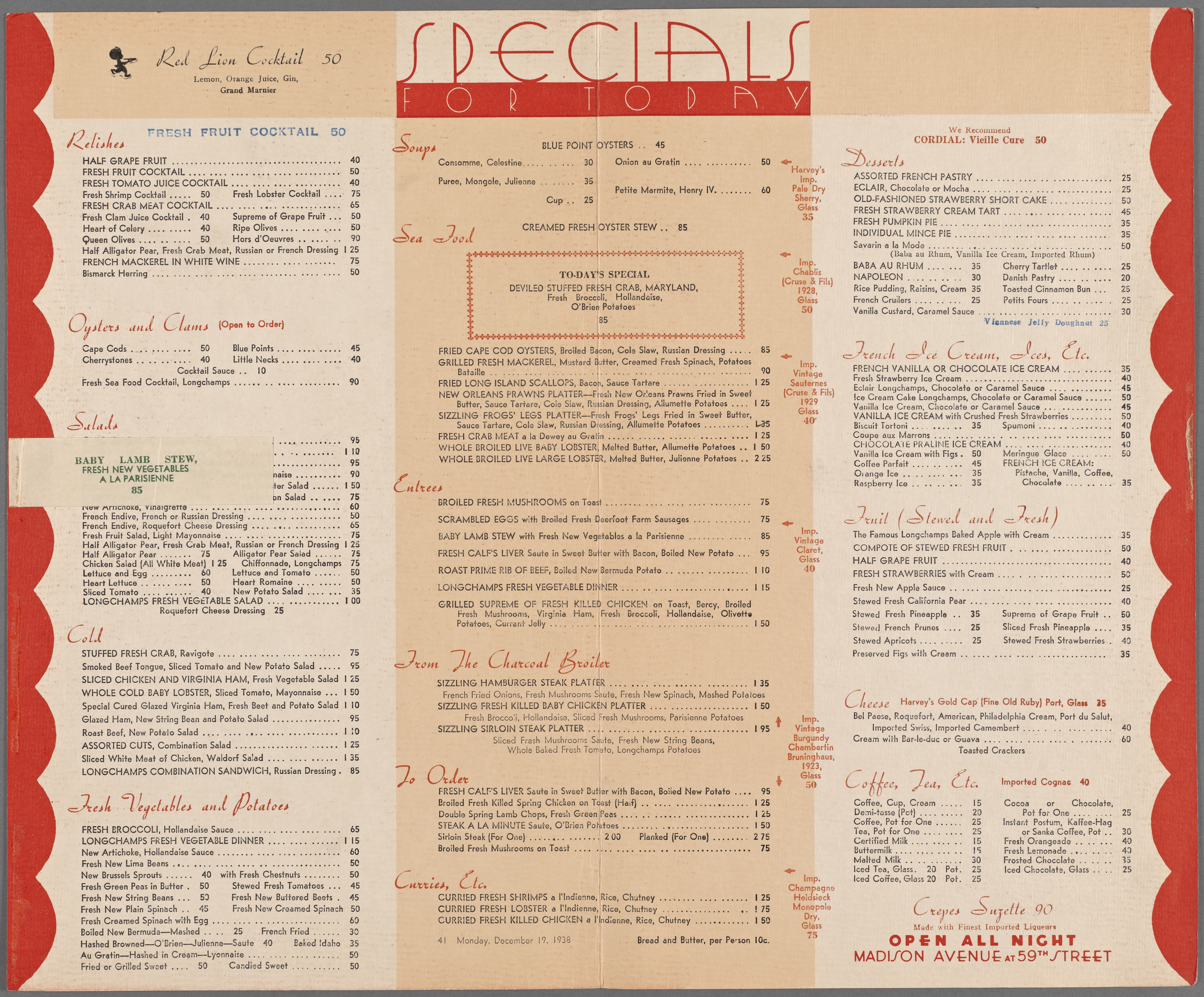 The marble tops of the now removed counters were of Vermont Verdi with a dado of red Verona. Surrounding the counter were aluminum stools with red leather upholstered seats and backs.