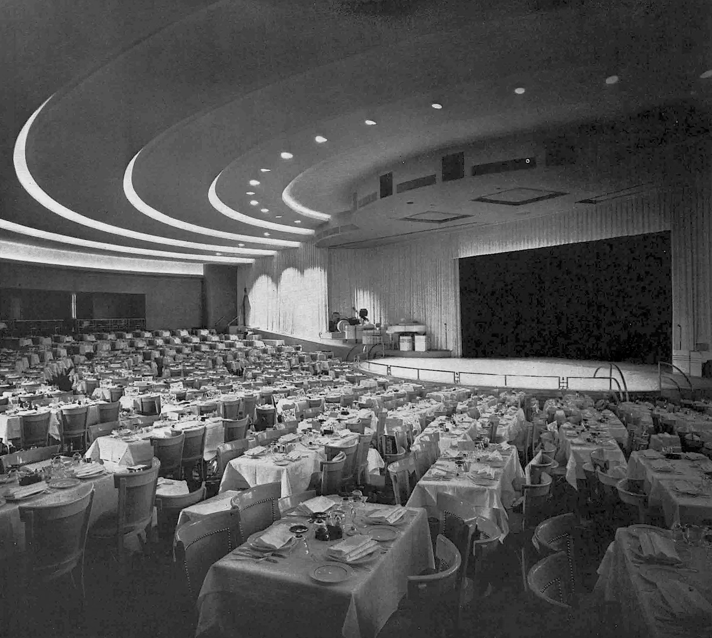 With a seating capacity of 1,200, the restaurant that took up most of the second floor’s space. As a restaurant the room was enormous, but as a fully equipped theatre it was on the small side. Stairways and platforms, mechanically lowered from the ceiling, increased the stage size during the floor show. Devoid of pattern and ornament, the restaurant relied on lighting and a wise use of color for creating the feeling of luxury.