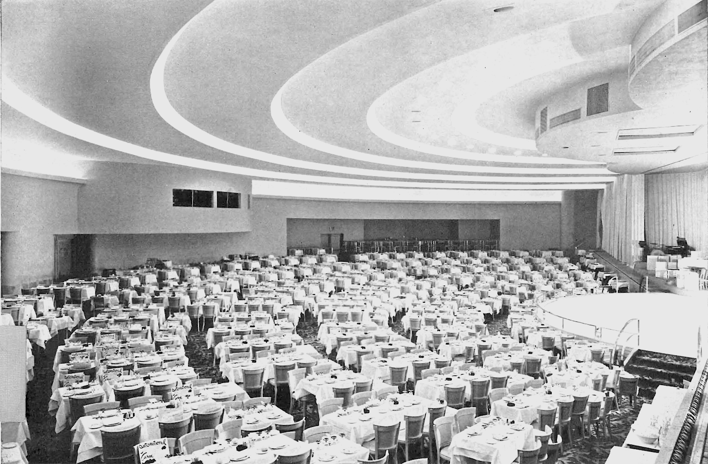 The International Casino’s restaurant, showing the dramatic semi-circular cove lighting of the ceiling. Robert M. Damora photograph, from the November, 1937 Architectural Forum, Pg 387.