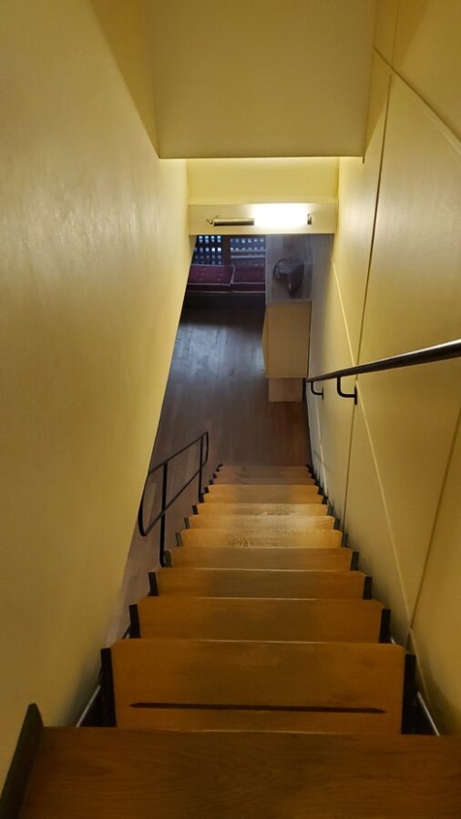 - A steep staircase rises to the second level.