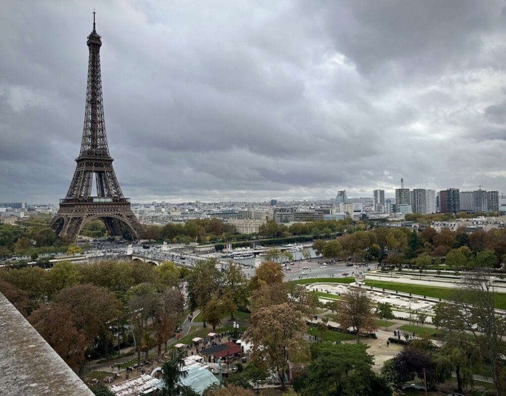 The daytime view of the Eiffel Tower and the Palais de Chaillot from the Salon d’About terrace.