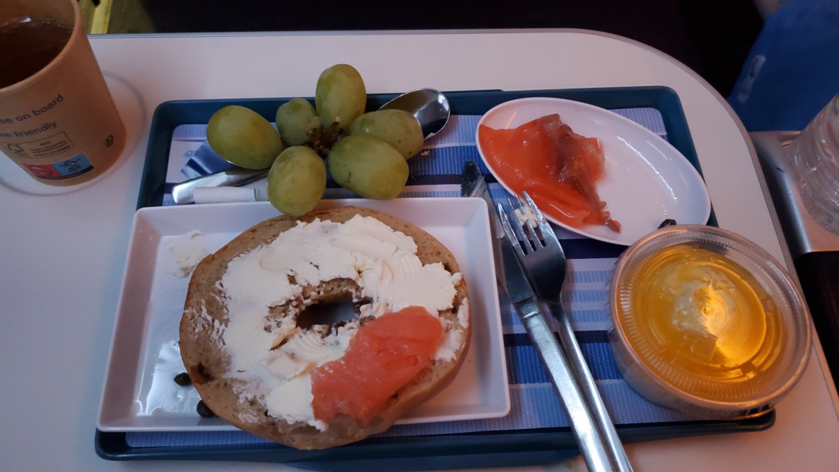 - Evening snack: Bagel, cream cheese, salmon, yogurt and grapes.