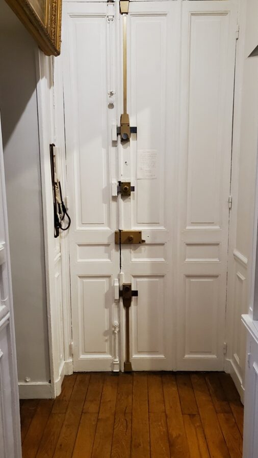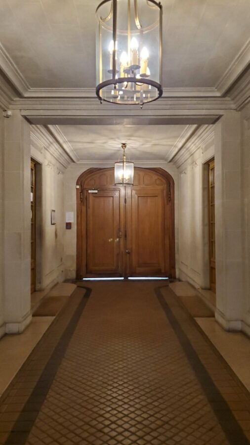 Entering the secure vestibule, we briefly waited for our host. The street side has a thick and heavy wooden door. Beautiful beveled glass doors at the far side lead into an impressive courtyard.