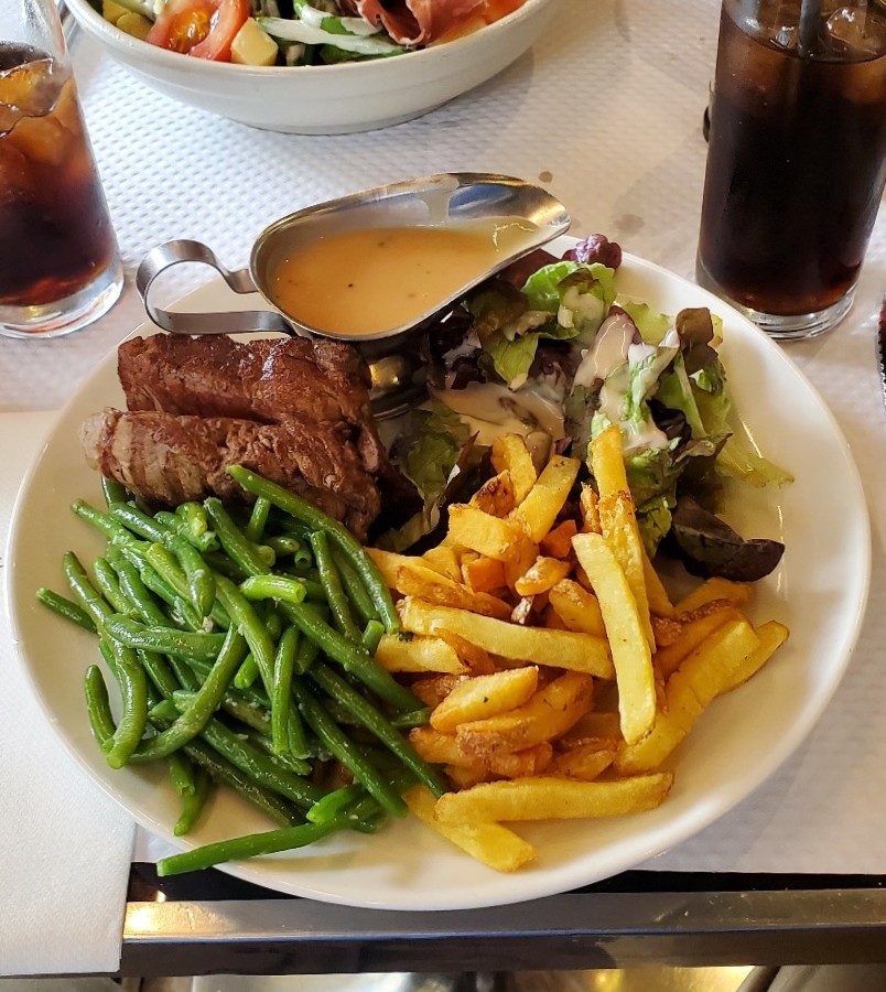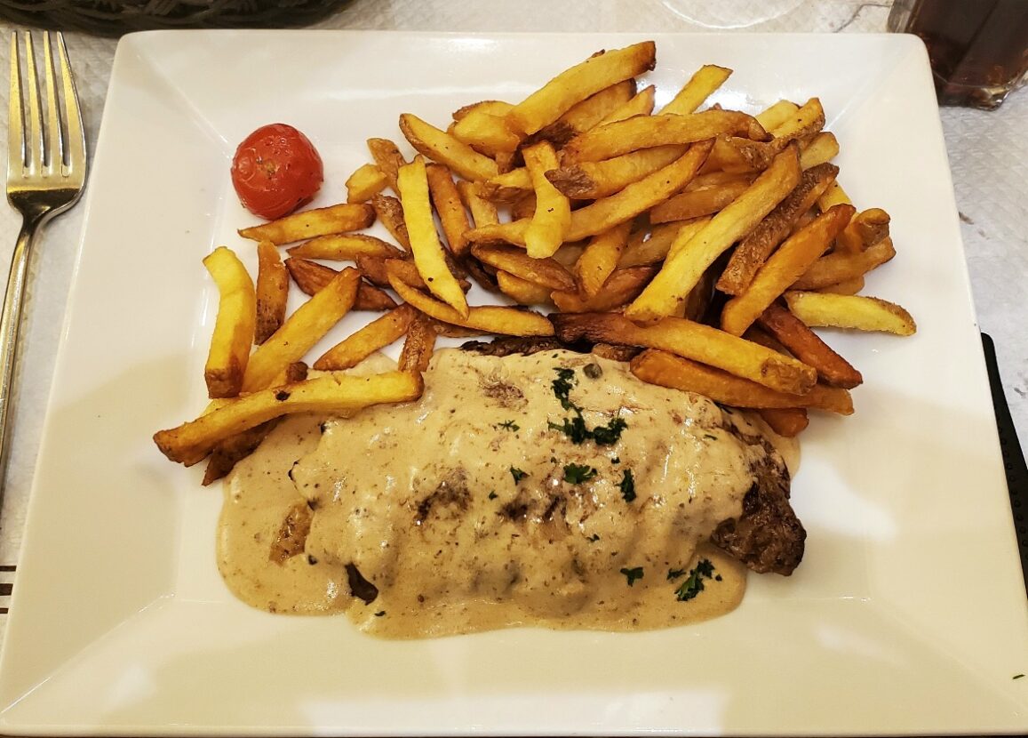 - Second course – Beef with pepper sauce and pommes frites.