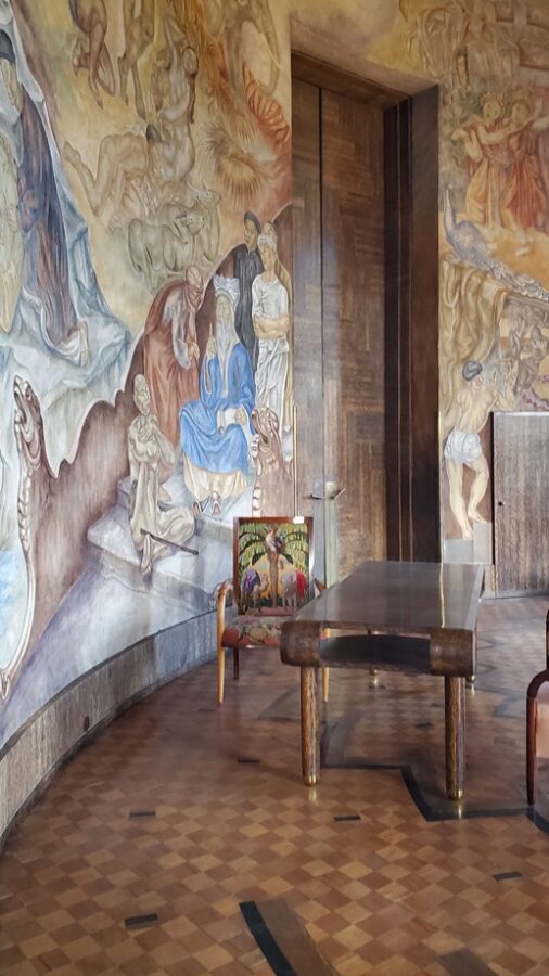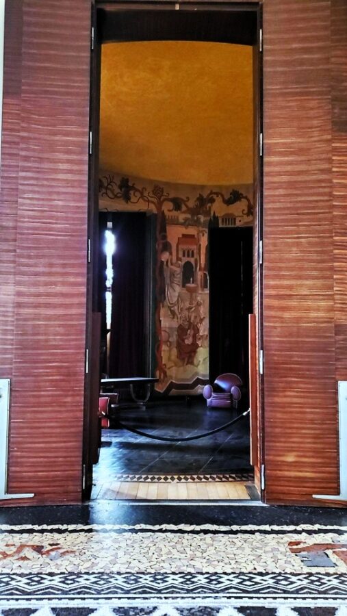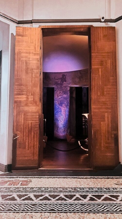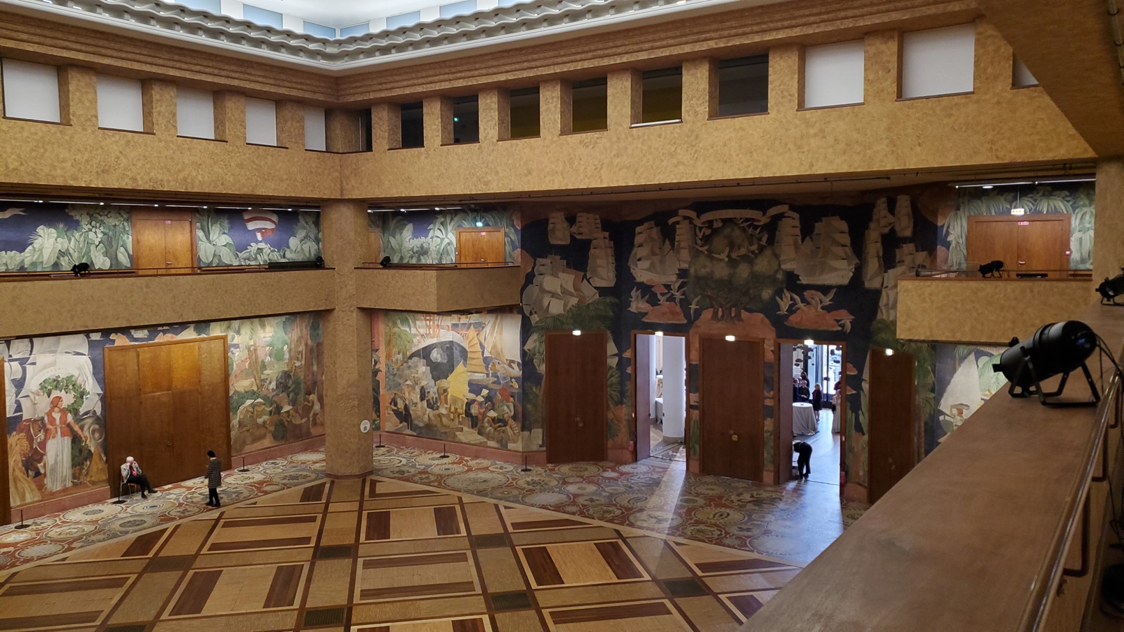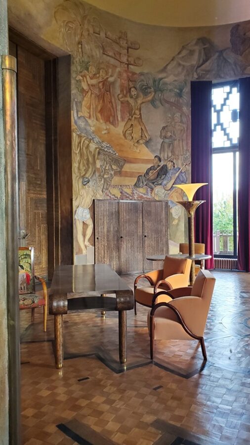 The interior décor of the room fell to Eugène Printz (1889 – 1948). Conceiving the design as a total system, Printz coordinated the overall look of the room from the furniture, the design of the floor and the exotic woods chosen. The highly contrasted patterns of the wood of the parquet floor of geometric and concentric echo the spherical shape of the room. Large lotus shaped lamps evoke Egypt. The mural is the joint creation of husband and wife artists André and Ivanna Lemaître. The mural depicts Krishna, Buddha and Confucius. And a caravan of elephants carry goods from Asia to France. The other walls cover themes of dance, music and sculpture.
