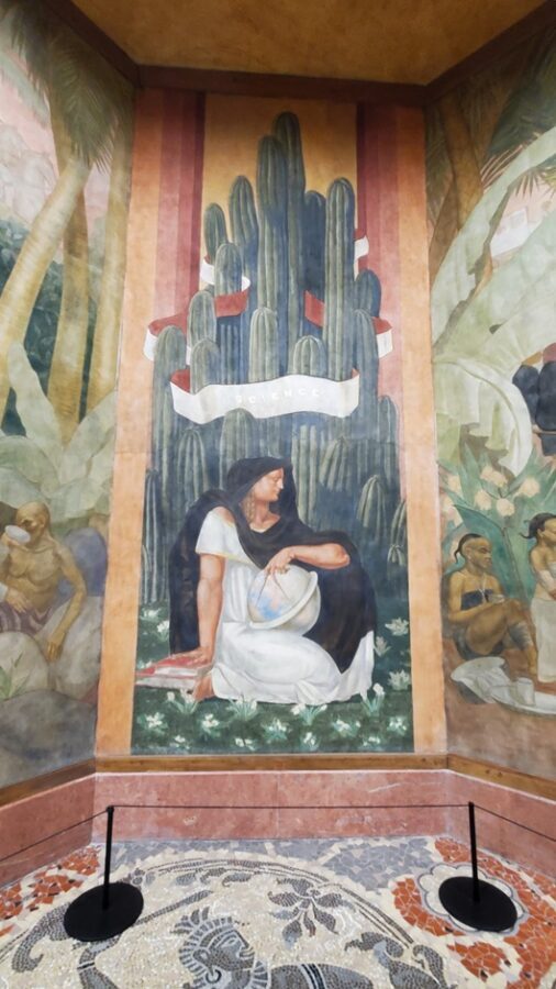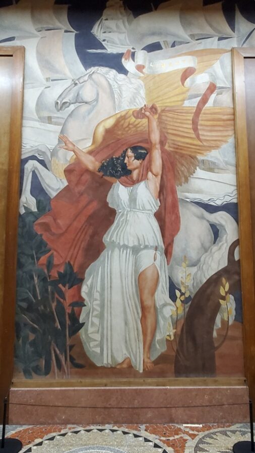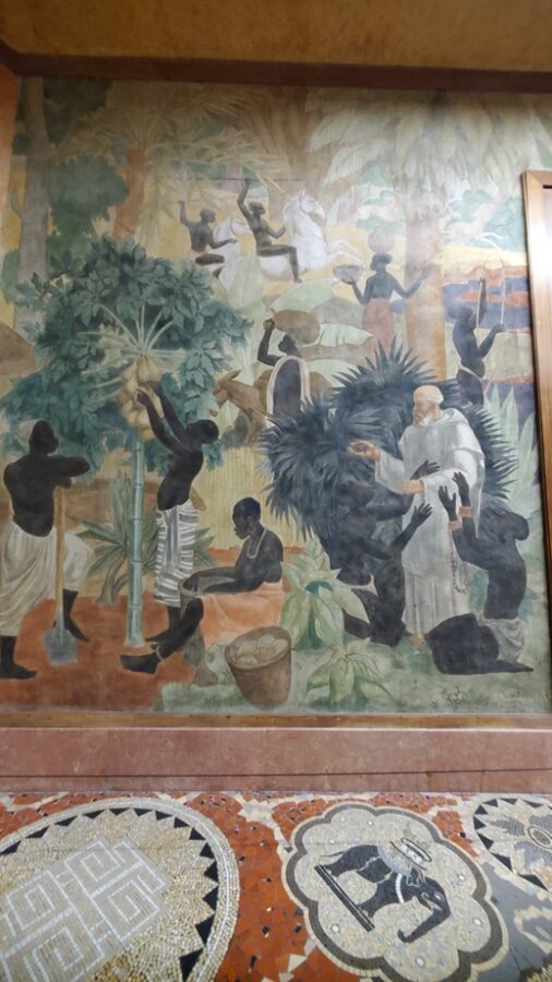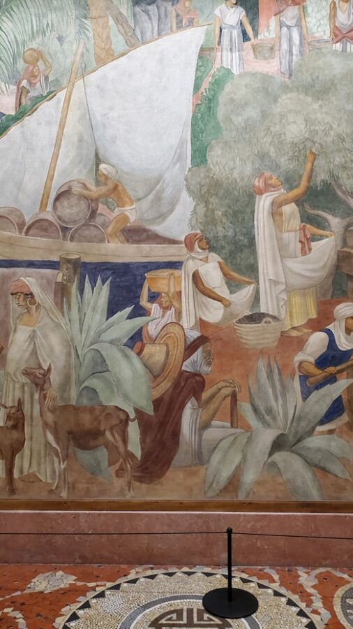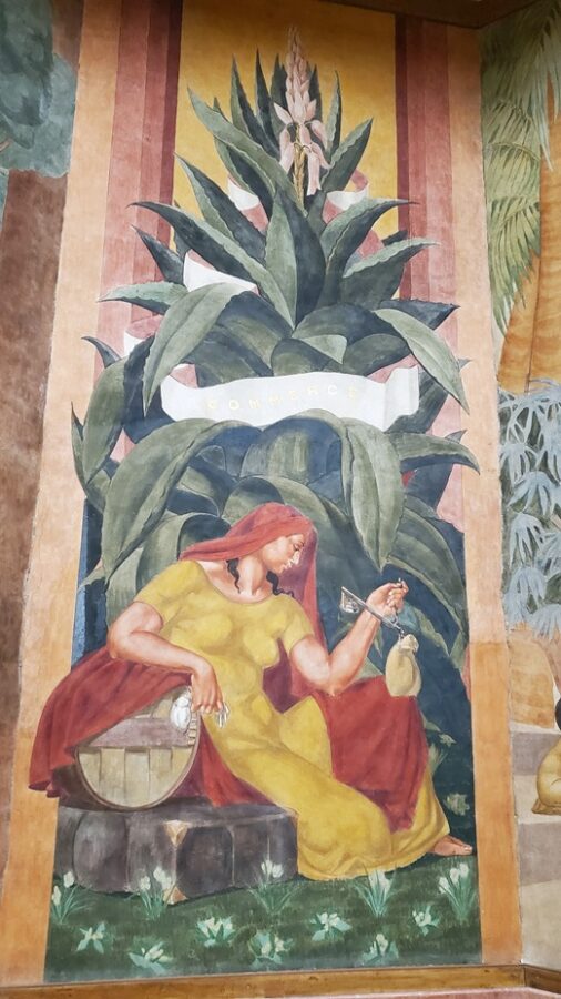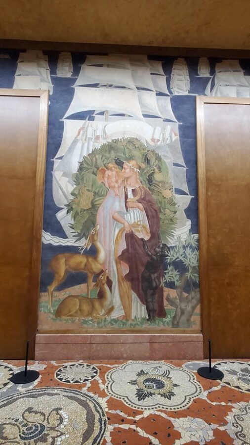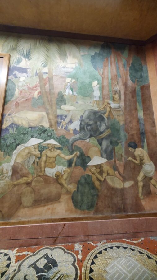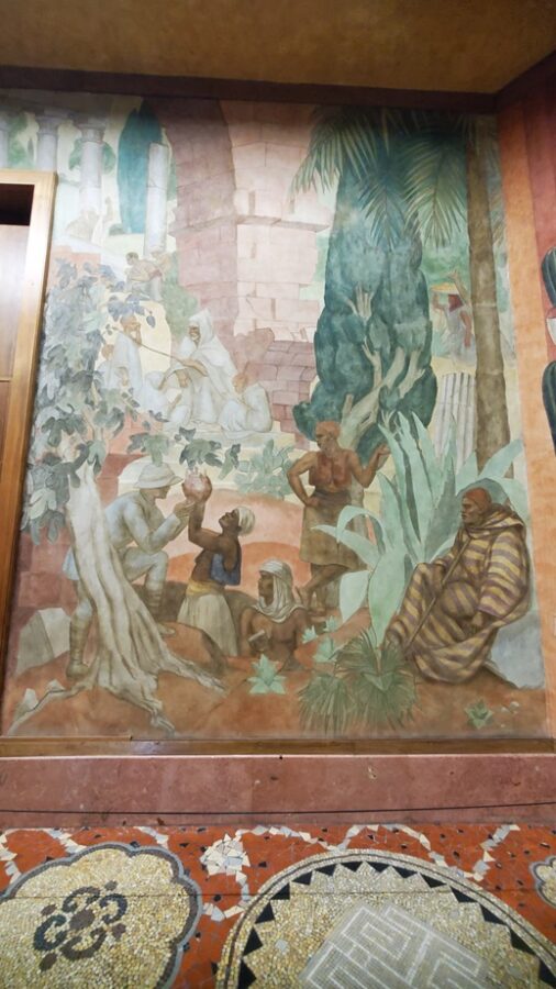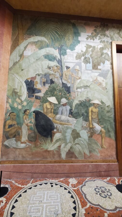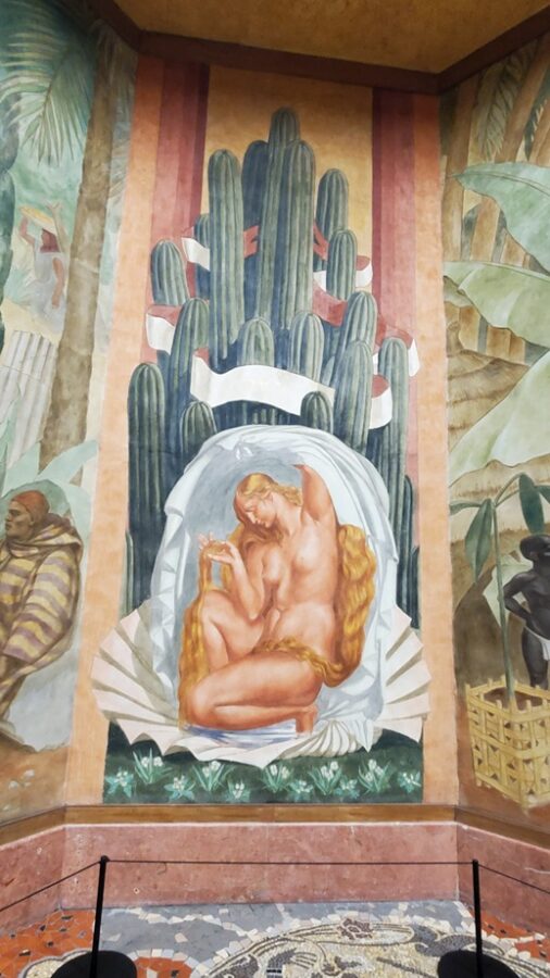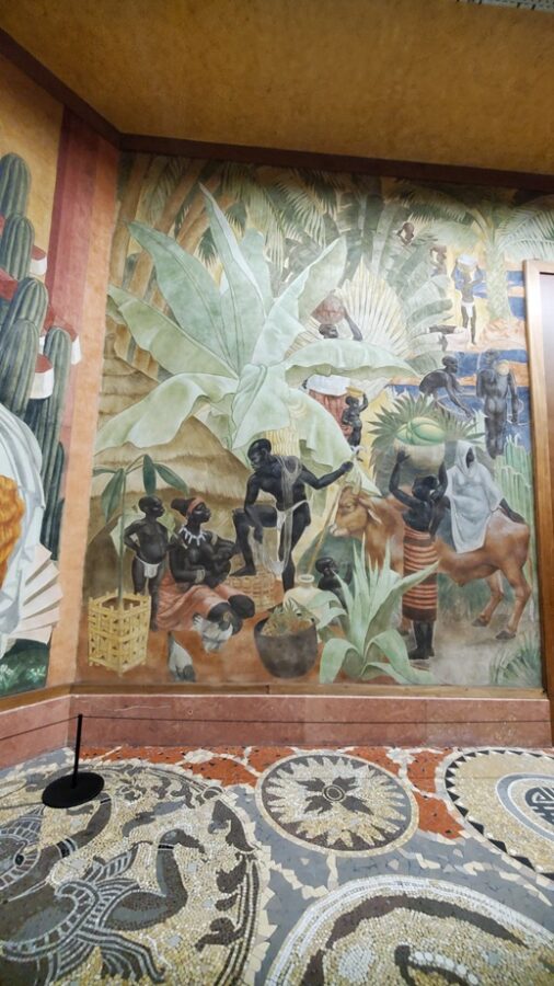 The most notable feature of the Festival Hall is the 1,968 foot fresco encircling the entire ground floor. Painted by Pierre-Henri Ducos de la Haille (1889 – 1972) and students from the École des Beaux-Arts. The fresco’s theme mirrors the bas-relief on the facade of the building, showing the benefits that France brings to its colonies. This is depicted in the form of allegories representing art, commerce, science, justice, industry, etc. Because this is a work of propaganda it completely ignores the reality of the exploitation of the colonies.