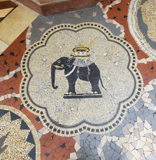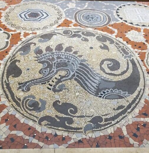 The red, black, yellow and gold mosaic floors created by Établissements Gentil & Bourdet, both in the Hall of Honour and the Festival Hall are works of art as well. Ceramist-architects Alphonse Gentil (1872-1933) and François Bourdet (1874-1952) used porcelain stone tiles and tessellas (small tiles) made of stone or glass paste against a gilded background.